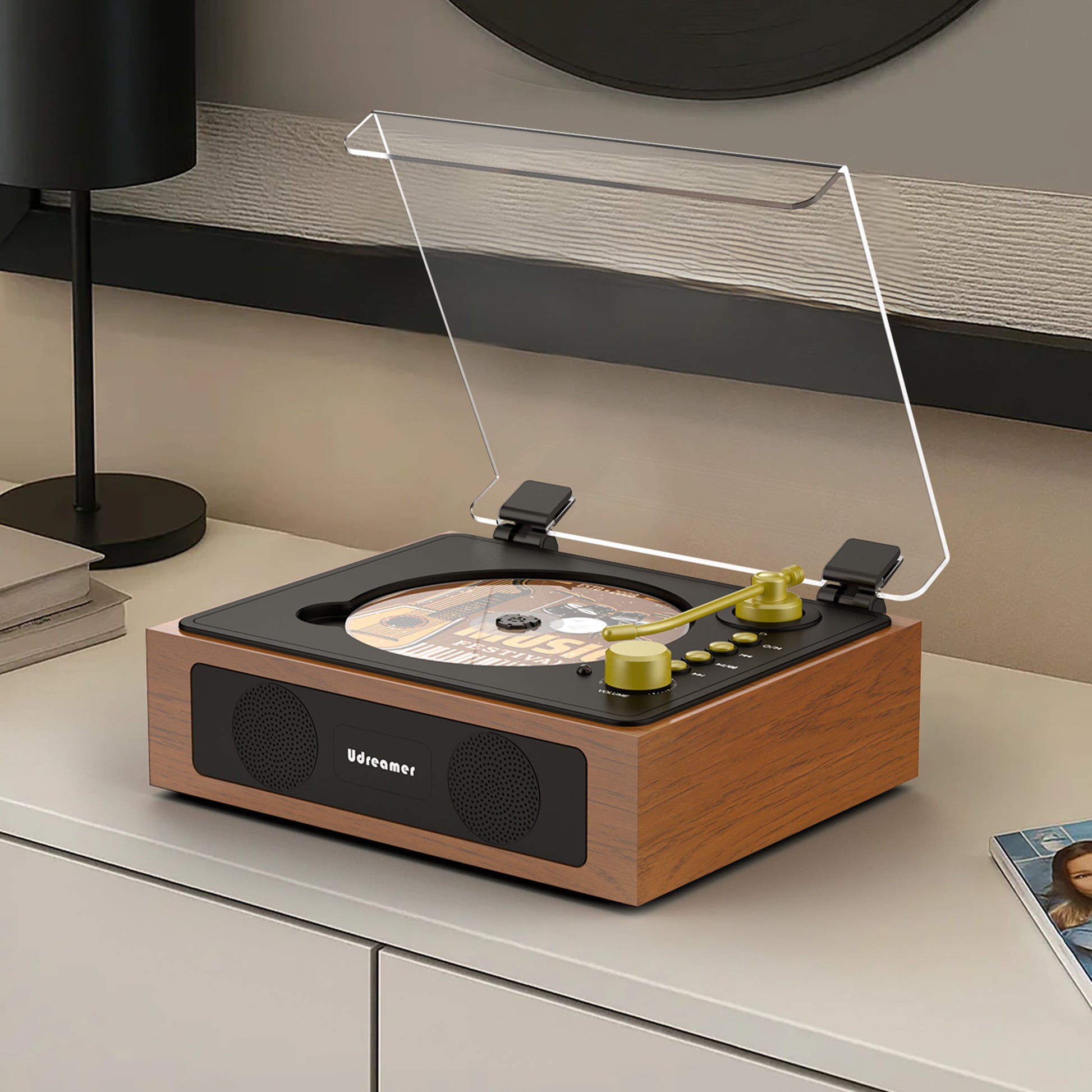 This CD player offers a versatile listening experience with multiple audio options. It features built-in dual HiFi loudspeakers and two 3W HIFI Bluetooth speakers for powerful sound. You can also connect your phone, tablet, or earphones wirelessly using the Bluetooth transmitter and receiver. For a more private listening experience, there's a 3.5mm wired headphone jack (headphones not included).