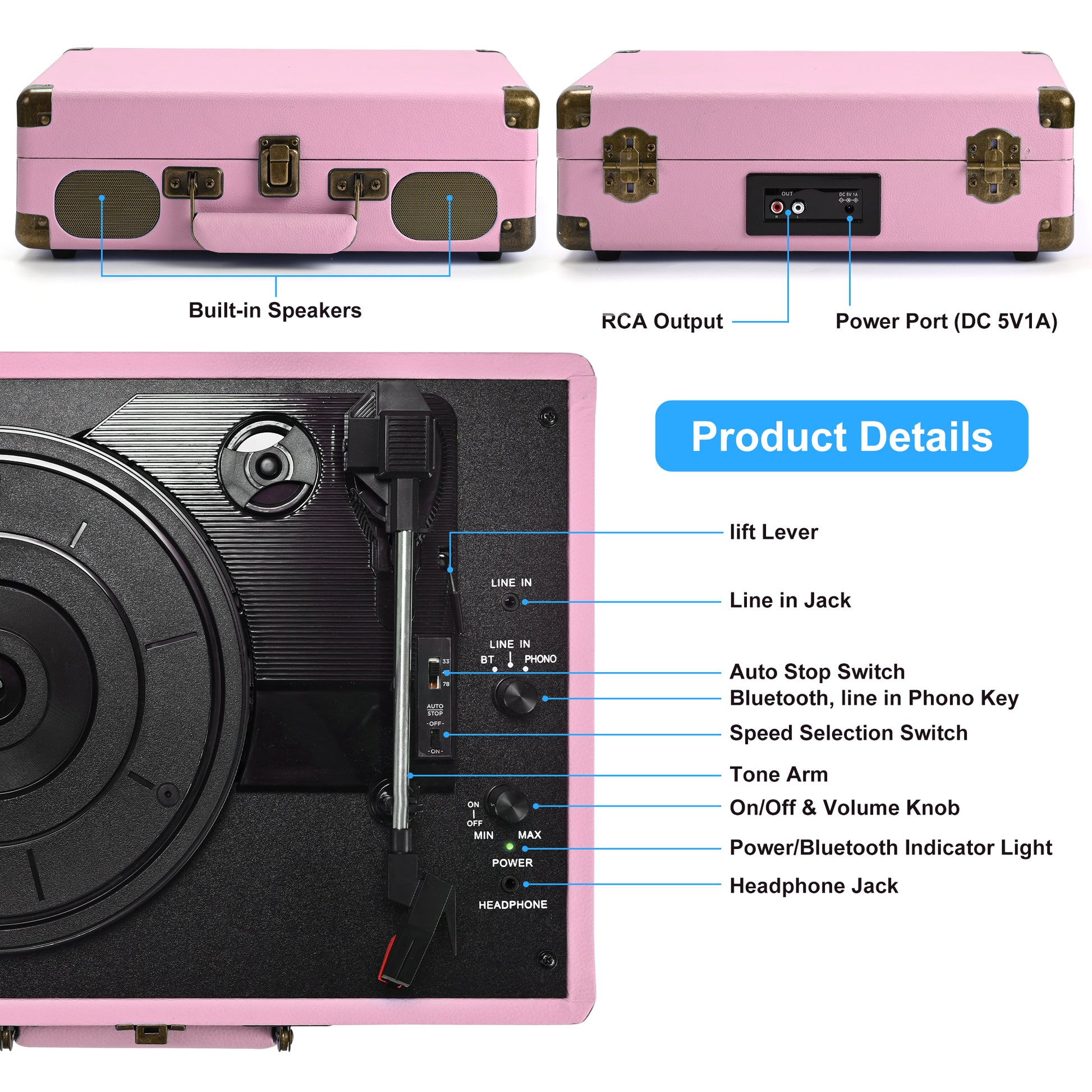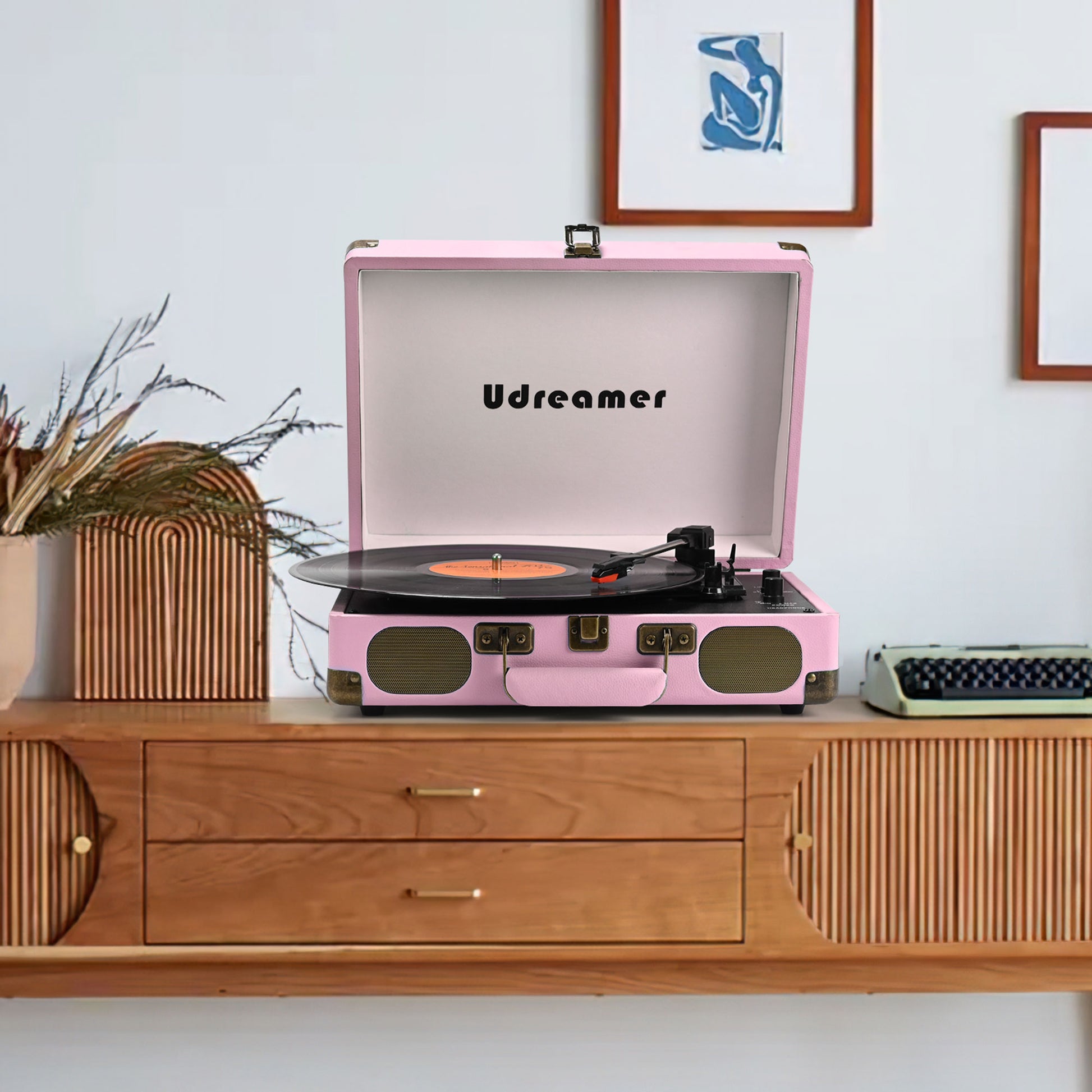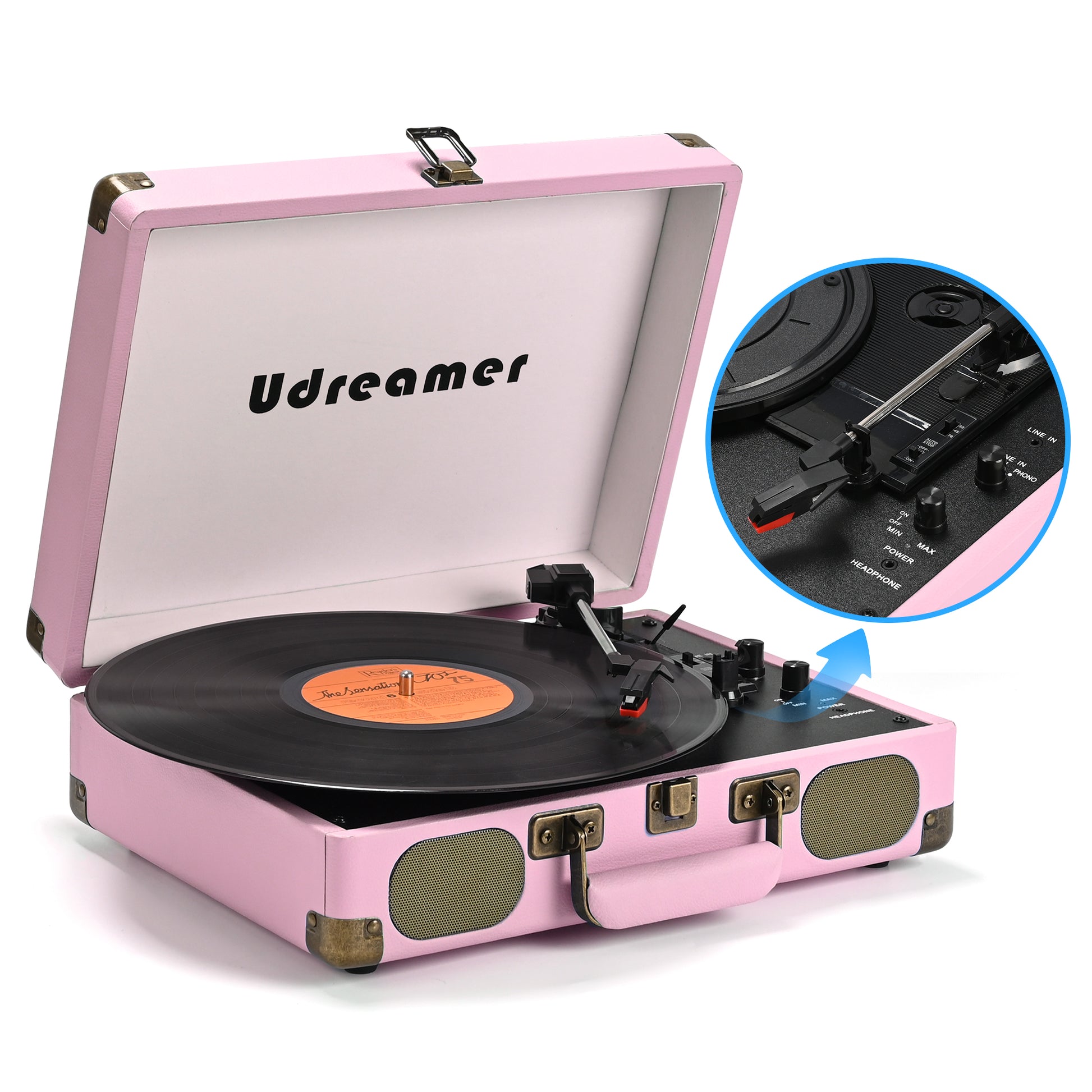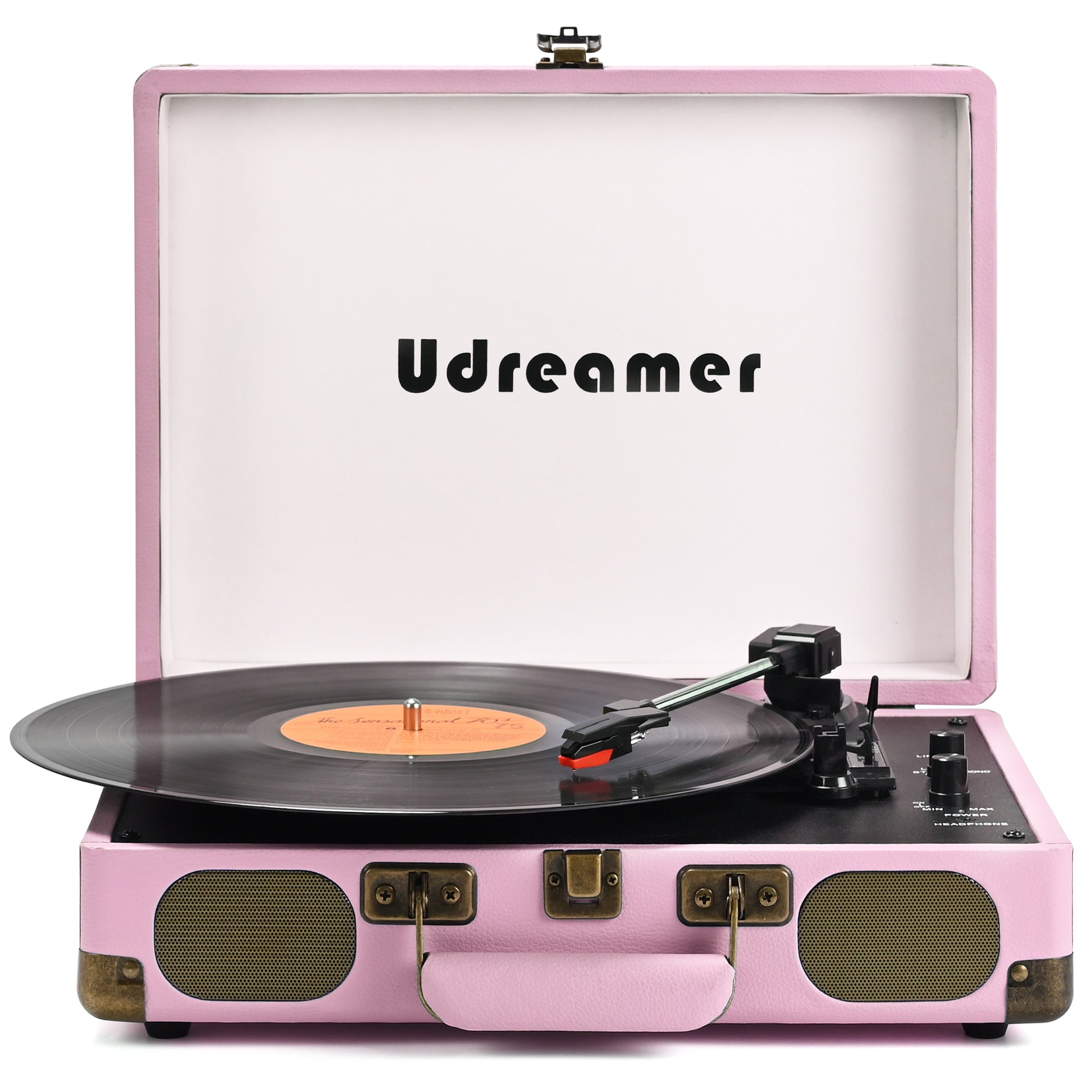 Udreamer Vinyl Record Player 3-Speed Turntable with Bluetooth,Suitcase Portable Vintage Audio Turntables,Pink