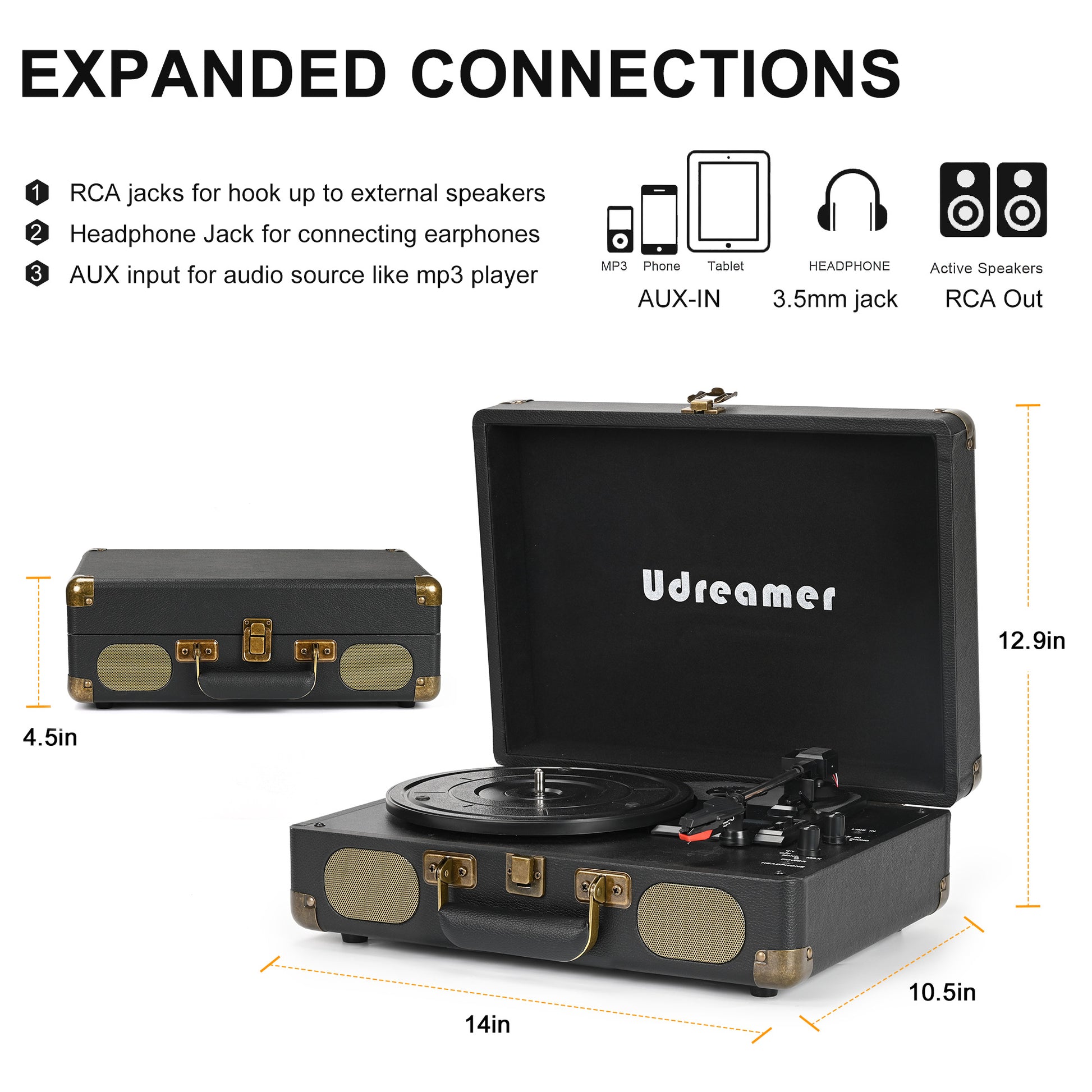 Udreamer Vinyl Record Player Turntable with Bluetooth,3-Speed Portable Vintage Audio Turntables,Black